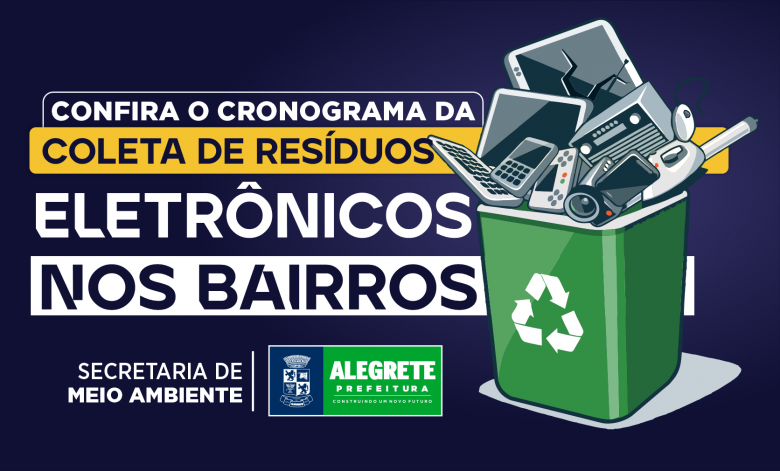 A Prefeitura de Alegrete, por meio da Secretaria de Meio Ambiente (Semmam), divulga o cronograma anual da Coleta de Resíduos Eletrônicos nos Bairros nesta quarta-feira, 12. A iniciativa consiste na descentralização do serviço já realizado pela Semmam, a fim de atender aos que não podem se dirigir ao ponto central de coleta.