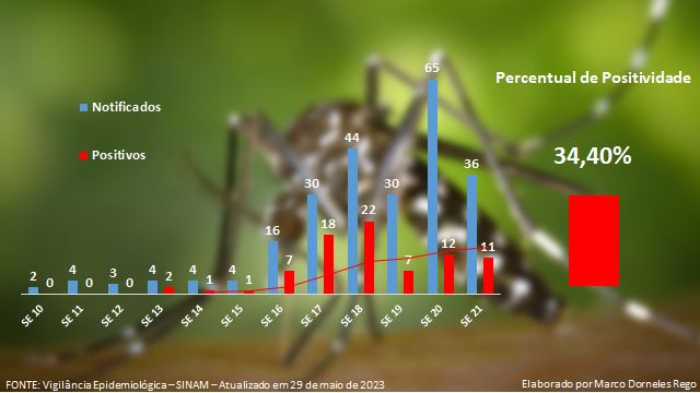 A semana corrente (de 23/05 a 30/05) apresentou aumento no volume de casos, totalizando 86 casos ativos (03 importados e 83 locais), sendo trinta e três (33) casos contabilizados nos últimos sete dias, somados aos cinquenta e três (53) divulgados no último relatório. Até o momento foram notificados 250 casos, sendo 59 descartados e 105 ainda encontram-se em investigação.