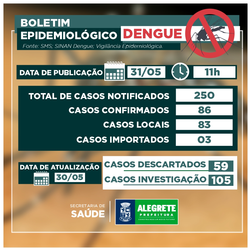 A Prefeitura de Alegrete, através da Secretaria Municipal de Saúde (SMS), divulga o Relatório Semanal da Dengue nesta quarta-feira, 31, a partir do monitoramento realizado nas regiões distribuídas entre os bairros do município. O levantamento é feito pela Vigilância Epidemiológica, em parceria com Sistema de Informação de Agravos de Notificação – SINAN Dengue – organizado e analisado pelo analista de dados da SMS, Marco Rego.