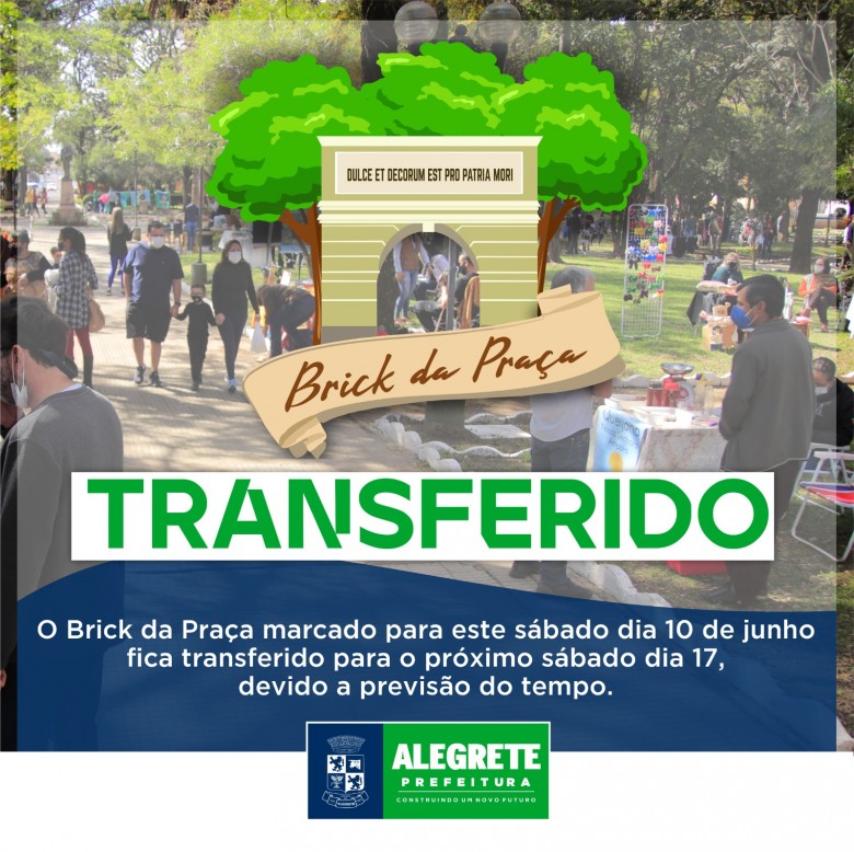 A Prefeitura de Alegrete, por meio da Secretaria de Educação, Cultura, Esporte e Lazer, através da diretoria de Cultura, com apoio das demais pastas, comunica que o Brick da Praça foi transferido para o próximo sábado, 17, devido às previsão do tempo. O evento ocorreria neste sábado, 10, das 09h às 17h, na Praça Getúlio Vargas.