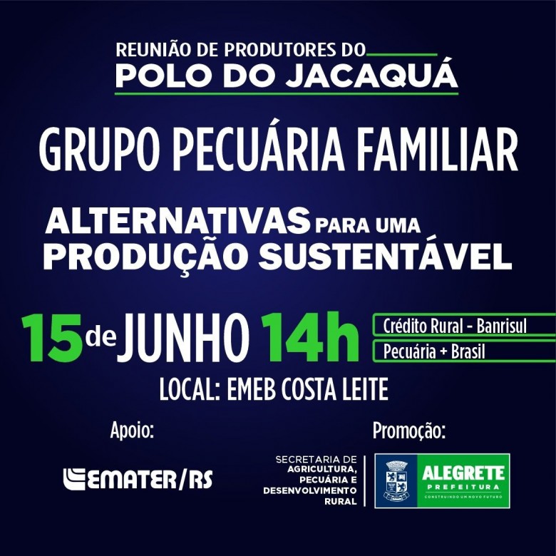 A Prefeitura de Alegrete, por meio da Secretaria de Agricultura, Pecuária e Desenvolvimento Rural (SAPDR), com o apoio do Instituto de Assistência Técnica e Extensão Rural – Emater, promove reunião com grupo de produtores familiares do Jacaquá nesta quinta-feira, 15, a partir das 14h, na EMEB Costa Leite (Polo do Jacaquá).