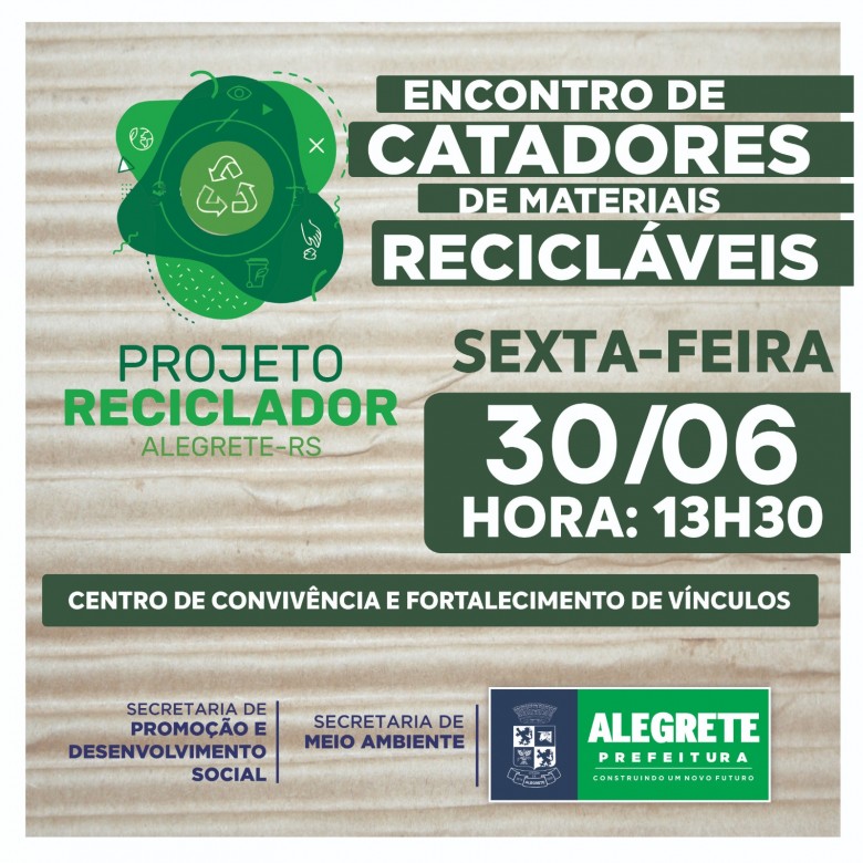 Nesta sexta-feira, 30, a Prefeitura de Alegrete, por meio das Secretarias de Meio Ambiente e Promoção e Desenvolvimento Social, realiza mais um encontro do Projeto Reciclador, a partir das 13h30, no Centro de Convivência e Fortalecimento de Vínculos (Av. Tiarajú).