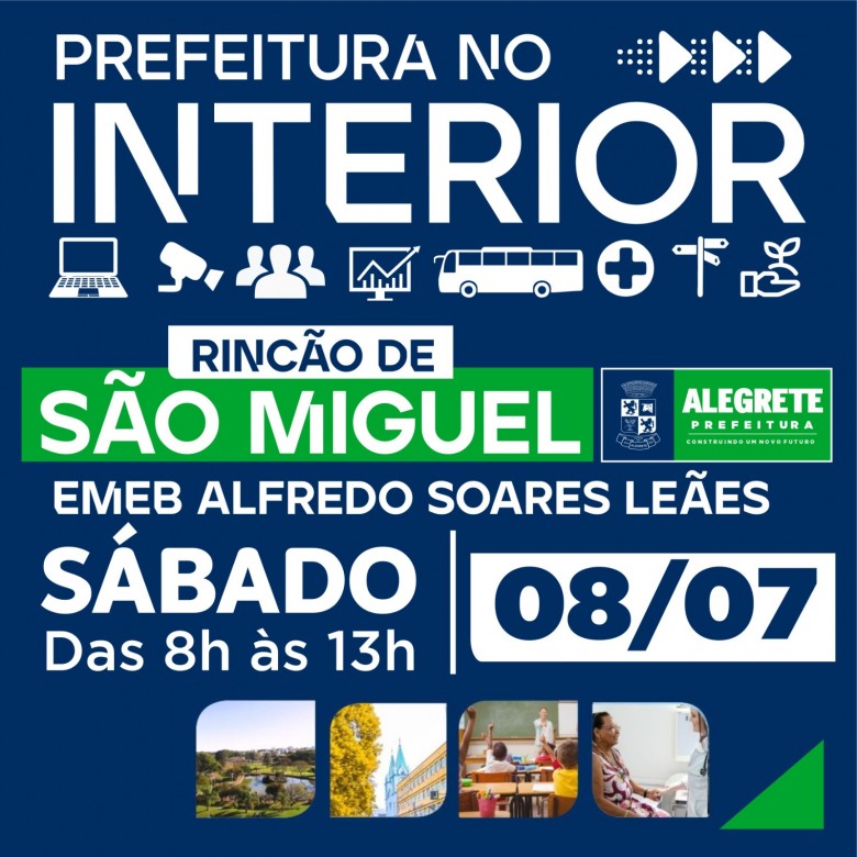 No próximo sábado, 24, o Rincão do São Miguel recebe a 8° Edição do Programa "Prefeitura no Interior". O evento será realizado na EMEB Alfredo Soares Leães, das 8h às 13h, com a presença do prefeito Márcio Amaral, do vice-prefeito Jesse Trindade e dos secretários municipais.