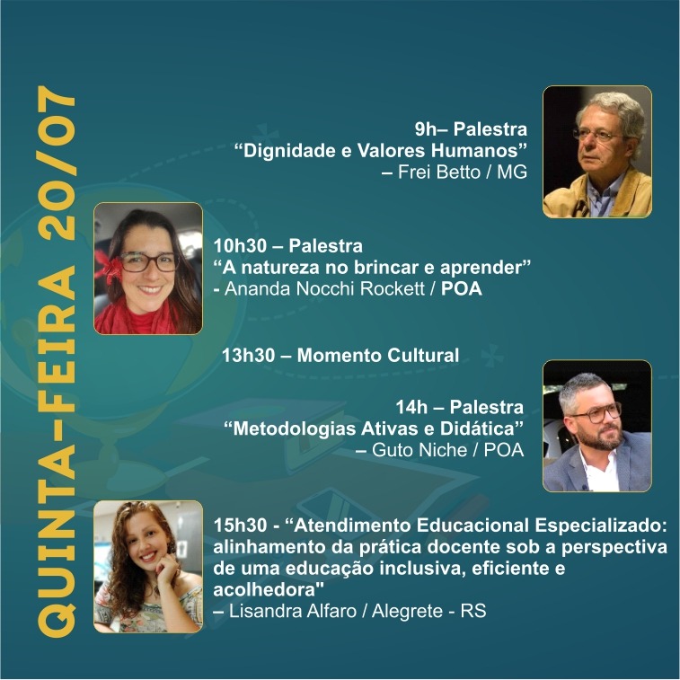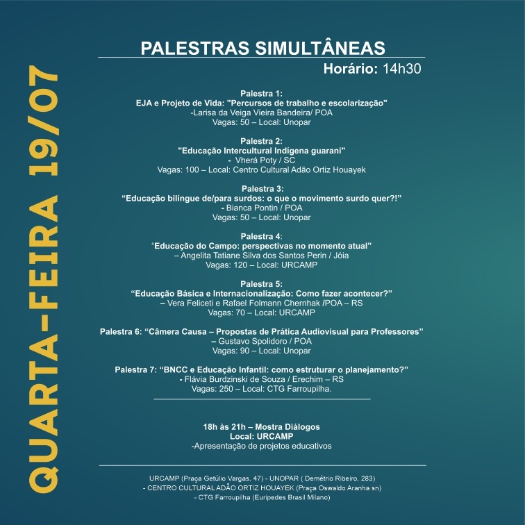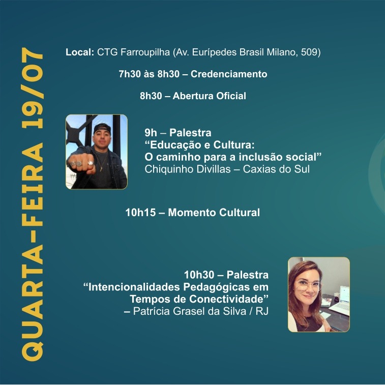 Com o tema "Perspectivas para uma Educação Global e Acolhedora", a Prefeitura de Alegrete, através da Secretaria de Educação, Cultura, Esporte e Lazer, em parceria com o Sistema Fecomércio - SESC e Senac, realiza o 22° Seminário Latino Americano de Educação e Cultura. O evento ocorre entre os dias 19 e 22 de julho, no CTG Farroupilha.