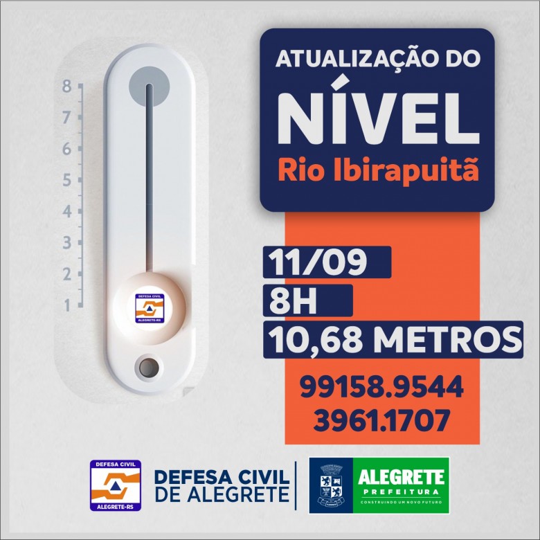 A Prefeitura de Alegrete, através da Defesa Civil, realizou a primeira atualização do nível do Rio Ibirapuitã nesta segunda-feira, (11/09). O rio encontra-se 10,68m acima do nível normal (recuando), conforme última medição realizada às 8h.
