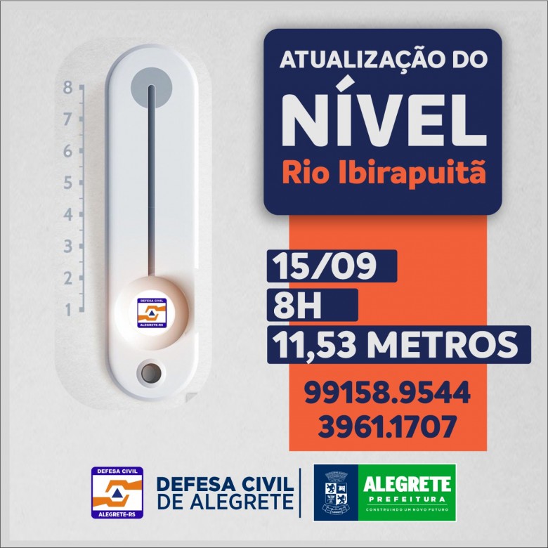A Prefeitura de Alegrete, por meio da Defesa Civil, realizou o último procedimento de medição dos níveis do rio Ibirapuitã no fim da tarde desta quinta-feira, 15. O rio encontra-se 11,53m acima do normal, conforme última atualização (8h).