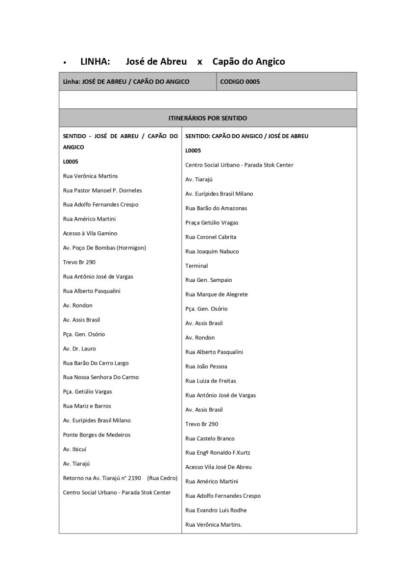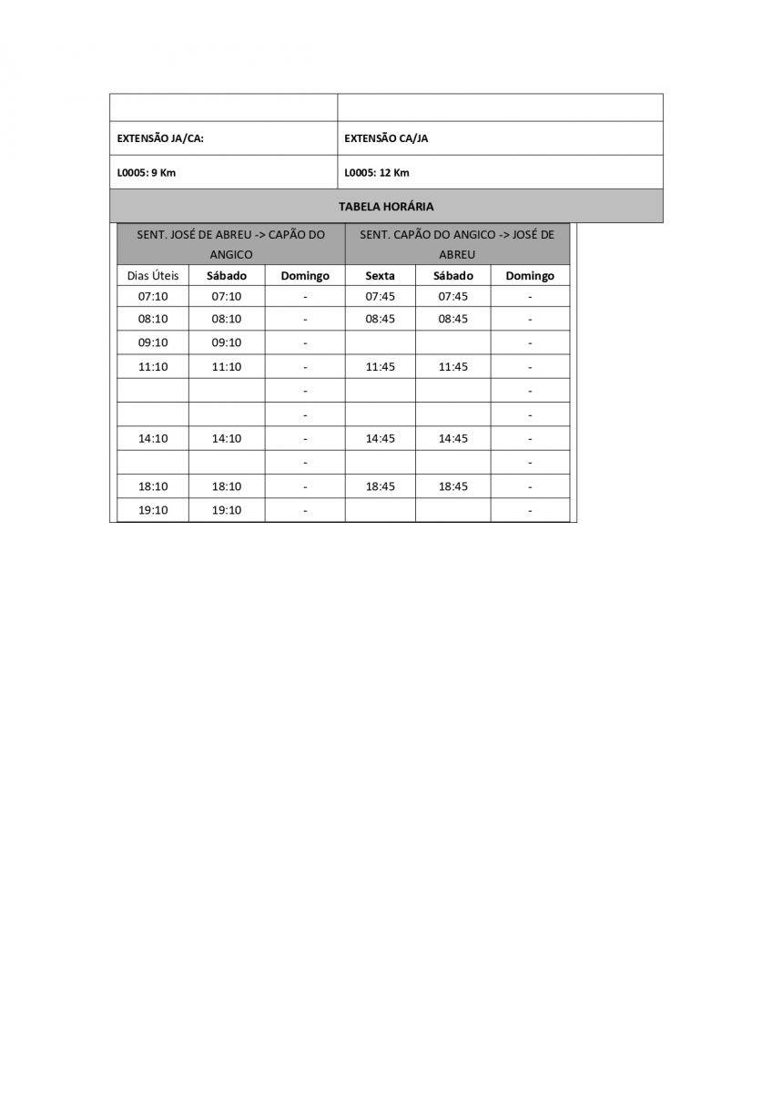 3°) Linha José de Abreu x Capão do Angico: "... altera os horários intercalados desta Linha, nos dias úteis de segunda-feira a sábado, nos seguintes horários: às 07h10, 08h10, 09h10, 11h10, 14h10, 18h10 e 19h10".
