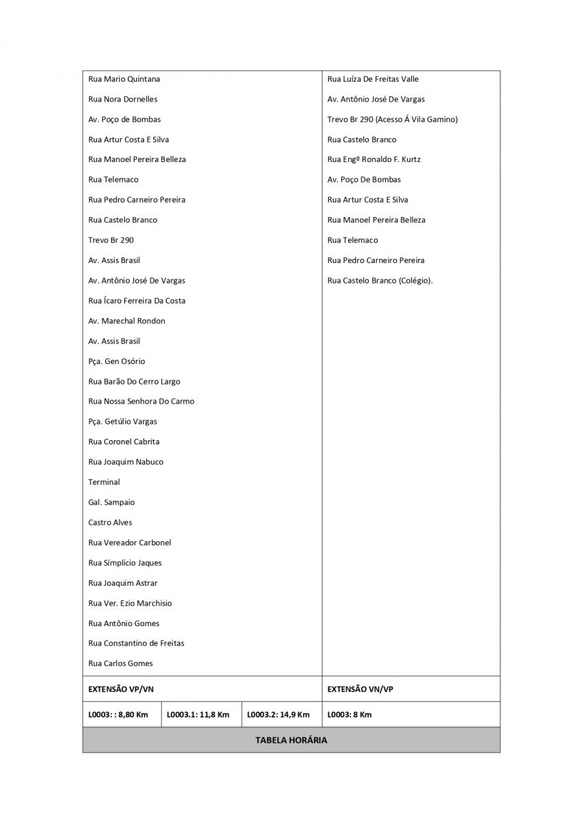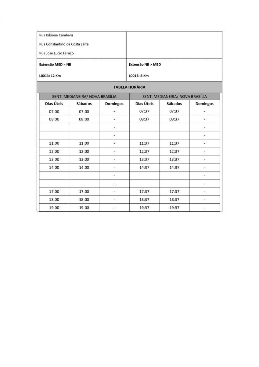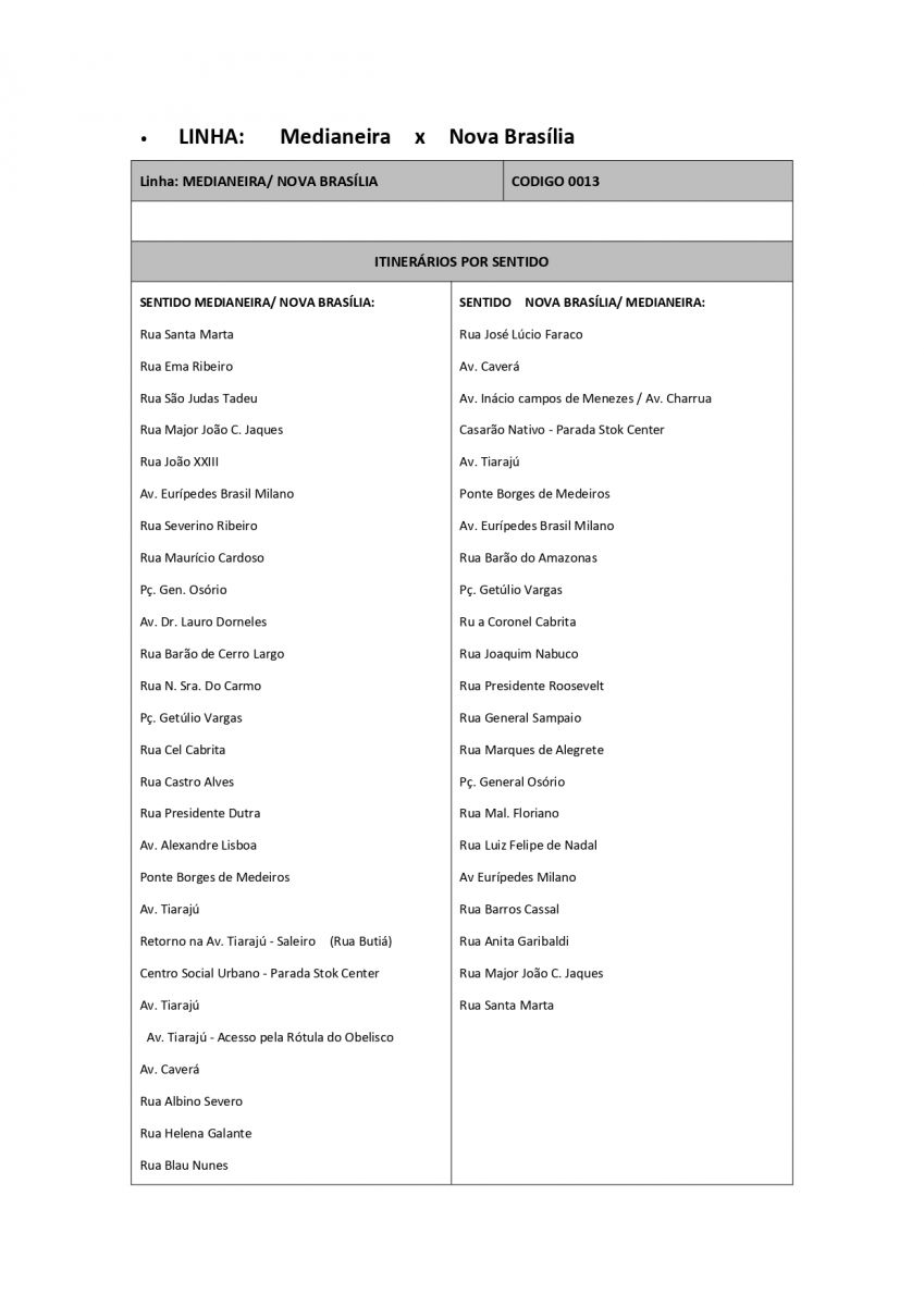 2°) Linha Medianeira x Nova Brasília: "... alteração no itinerário no Bairro Nilo Soares Gonçalves e proximidades, atendendo apenas as seguintes vias: Rua Albino Severo, Rua Helena Galante, à direita na Rua Blau Nunes e na Rua Bibiana Cambará, saindo para o Bairro Nova Brasília, ou seja, deixará de passar nas vias: Rua Helena Galante, Rua F - Visionário Zoares, Av. Simões Lopes Neto, Rua Érico Veríssimo, Rua Mãe do Ouro, Rua Rodrigo Cambará, Av. Simões Lopes Neto, Rua Rua F - Visionário Zoares".