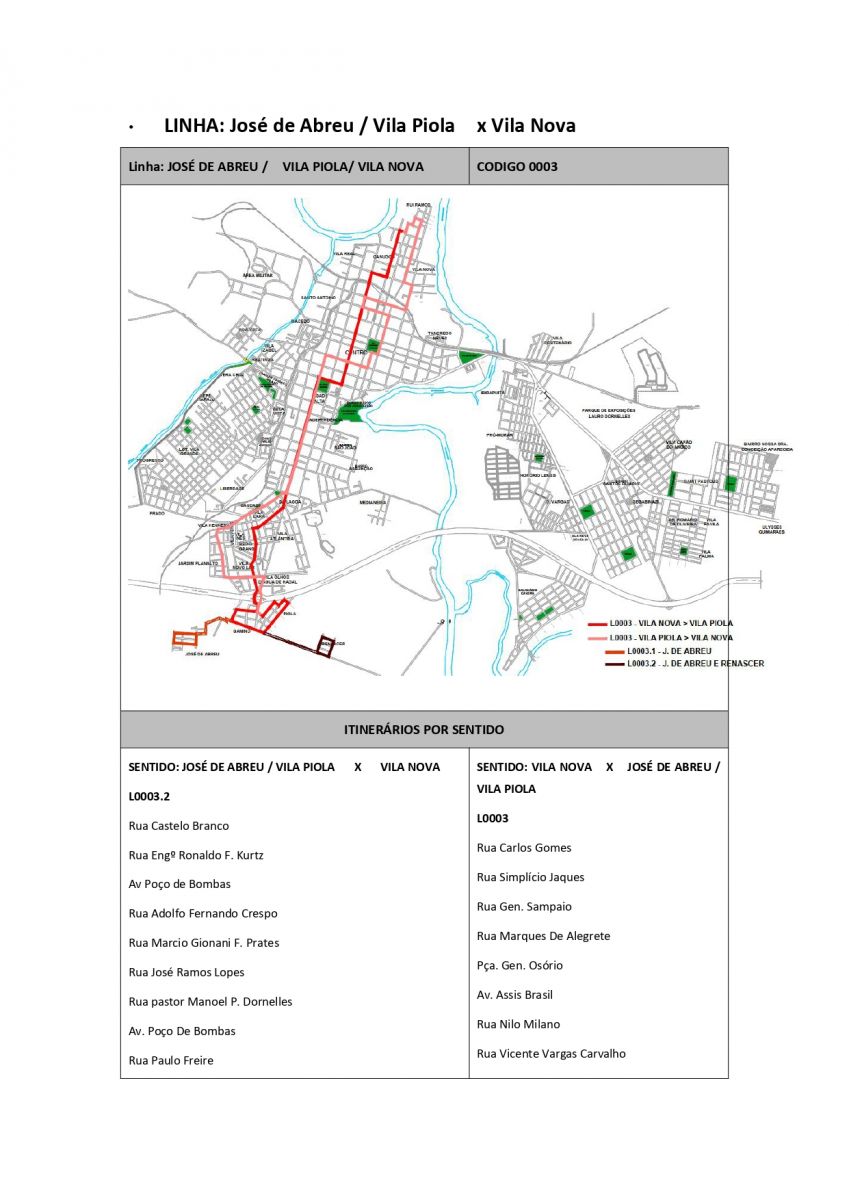 1°) Linha José de Abreu / Vila Piola x Vila Nova: "... com o atendimento DE HORA EM HORA na Vila Piola, alterando os horários intercalados nos Bairros José de Abreu e Renascer com a Linha Unificada, de segunda a sábado, com início da linha às 06h50. Demais horários: 10h, 12h, 13h, 15h, 17h, 19h.