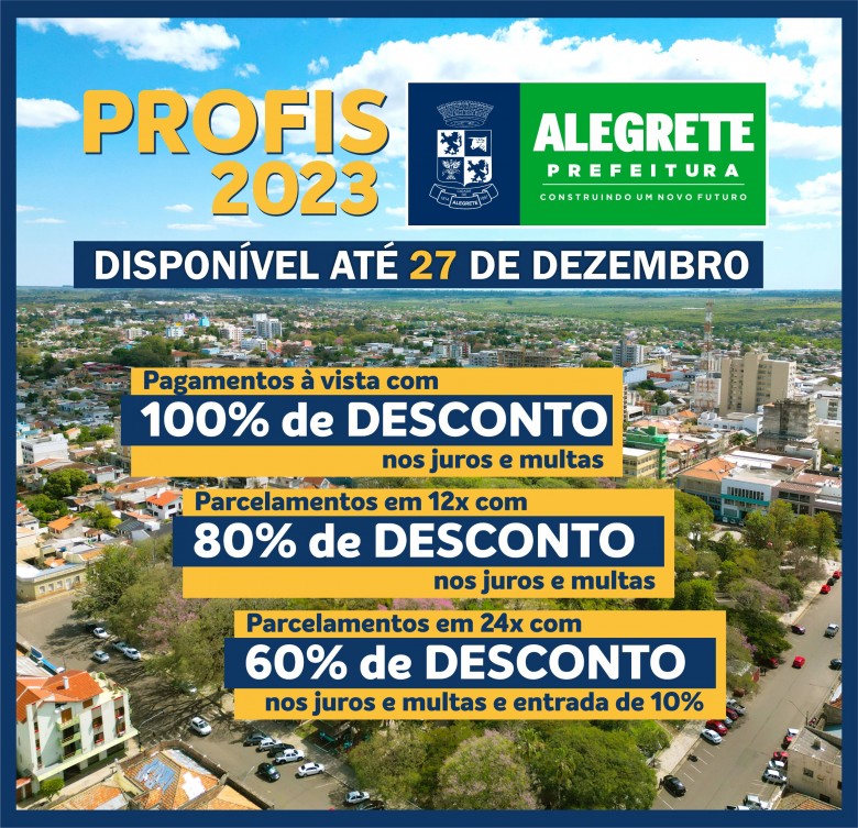 A Prefeitura de Alegrete, por meio da Secretaria de Finanças, promove a regularização de inadimplentes através do Profis 2023, que estará disponível até o próximo dia 27 de dezembro, referente à Lei n° 6735/2023.