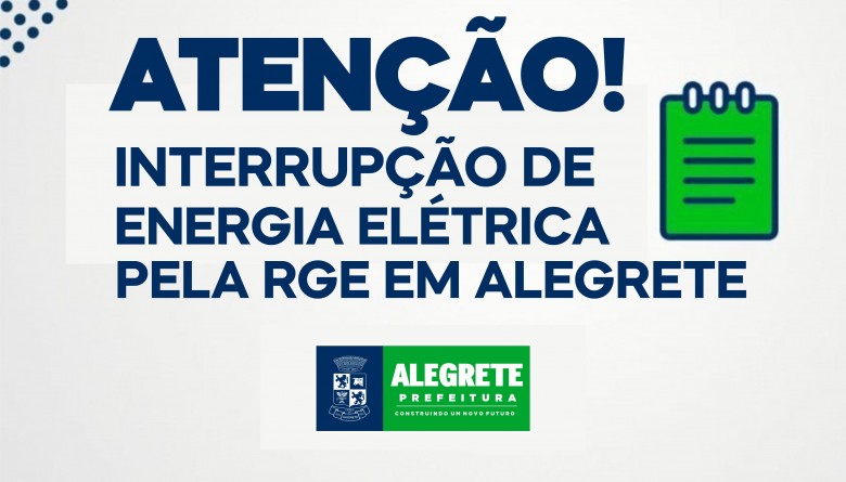A RGE comunica que haverá interrupção no fornecimento de energia elétrica, devido a manutenção e melhorias, o que afeta algumas regiões no município de Alegrete entre os dias 04 e 09 de dezembro. Confira os períodos e locais onde haverá interrupções nos links a seguir: