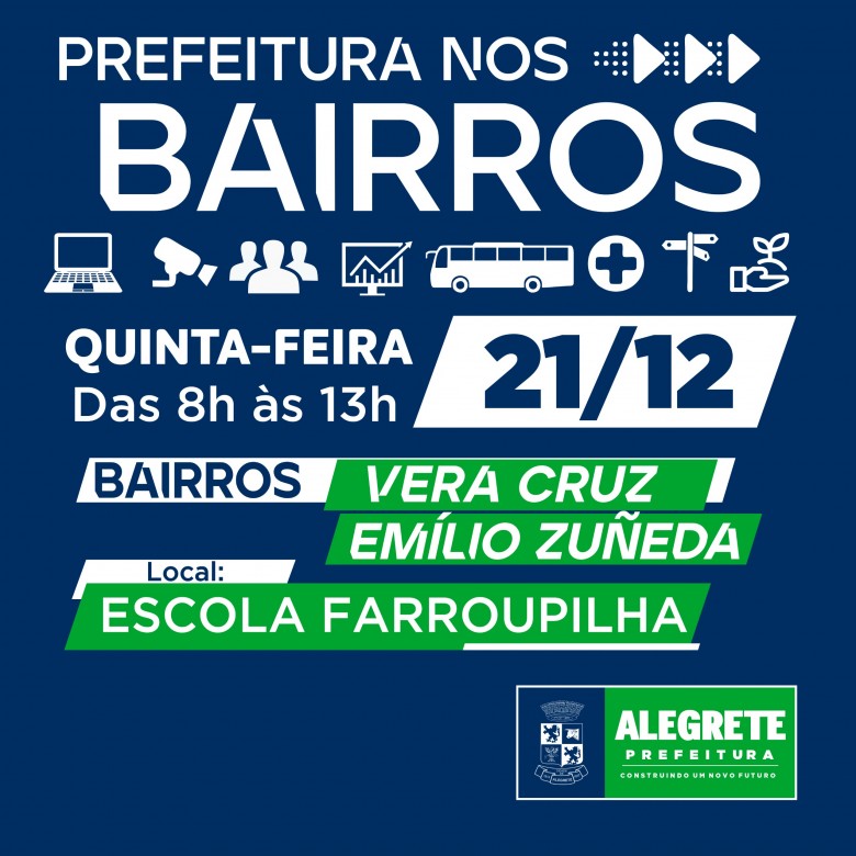 Na próxima quinta-feira, 21, os bairros Vera Cruz e Emílio Zuñeda recebem o programa "Prefeitura nos bairros". O evento será realizado na Escola Farroupilha, das 8h às 13h, com a presença do prefeito Márcio Amaral, do vice-prefeito Jesse Trindade e dos secretários municipais.