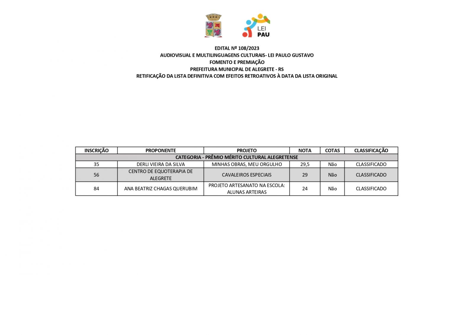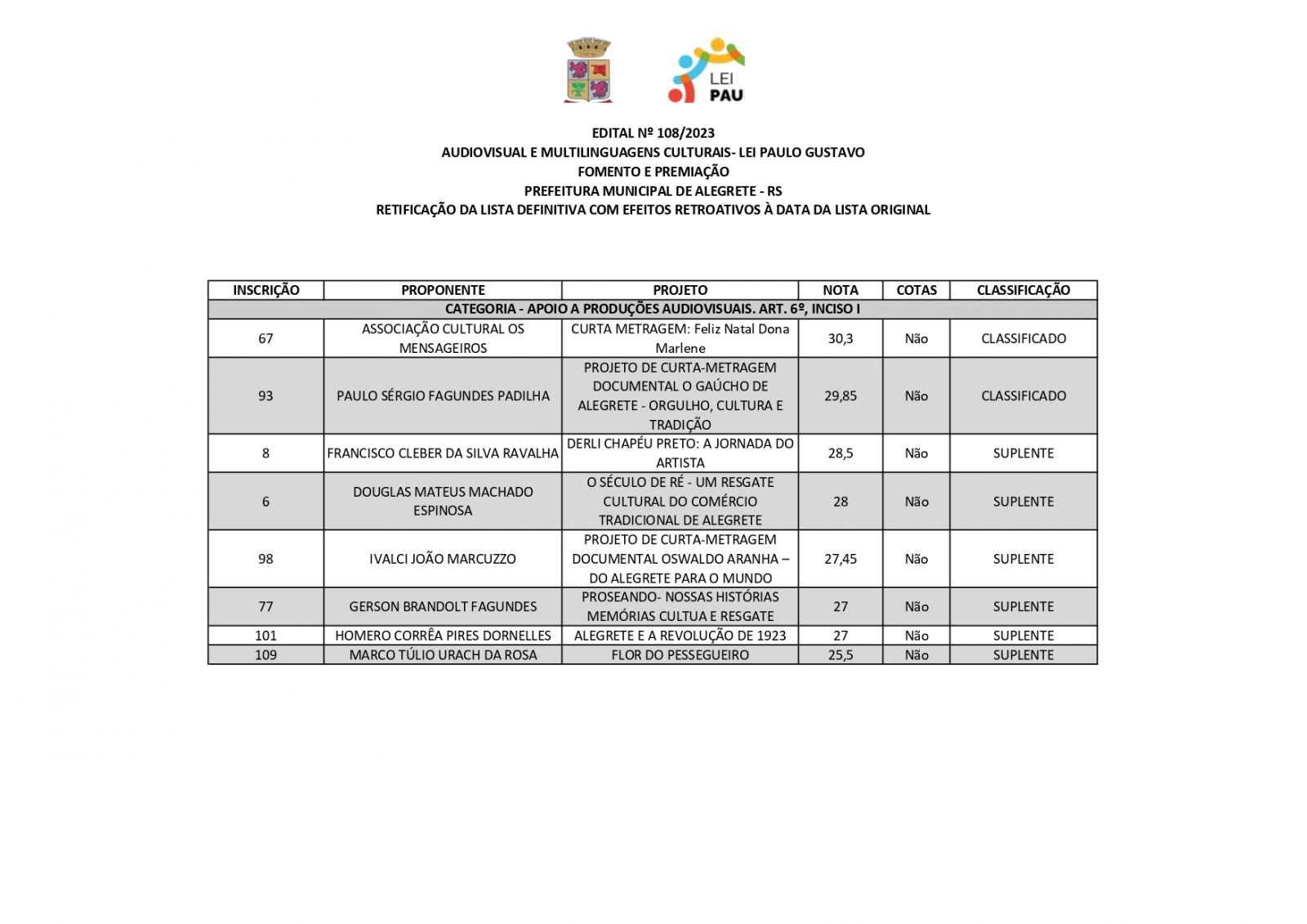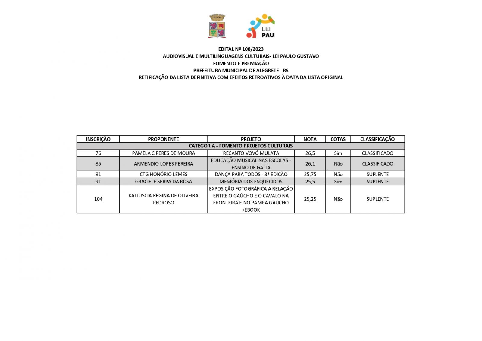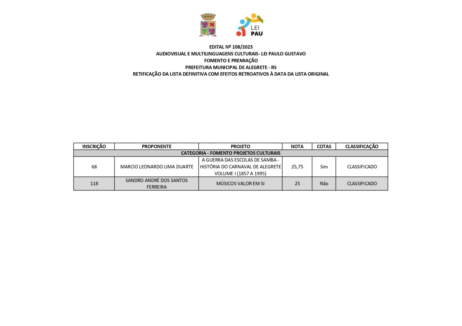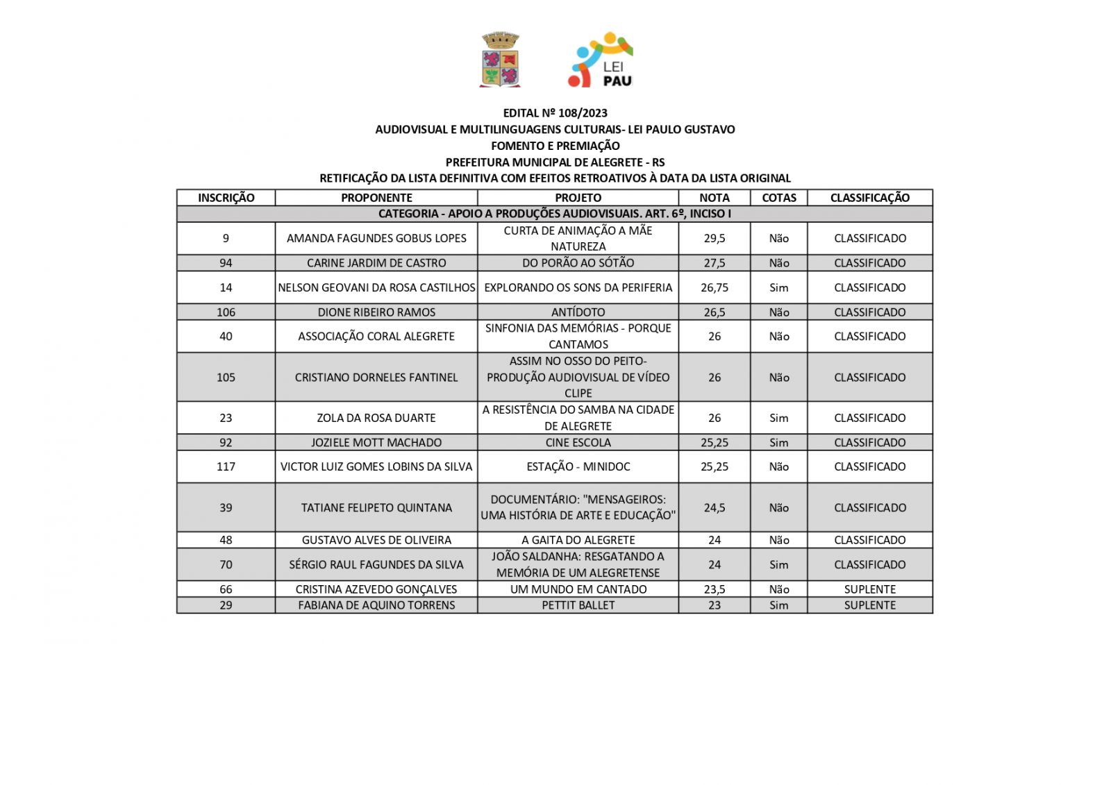 A Prefeitura de Alegrete, por meio da Secretaria de Educação, Cultura, Esporte e Lazer (Secel), através da Diretoria de Cultura, divulga retificação do resultado final dos projetos estabelecidos no edital n°108/2023, referente a Lei Complementar n°195/2022 – Lei Paulo Gustavo – nesta terça-feira, 19 de dezembro.