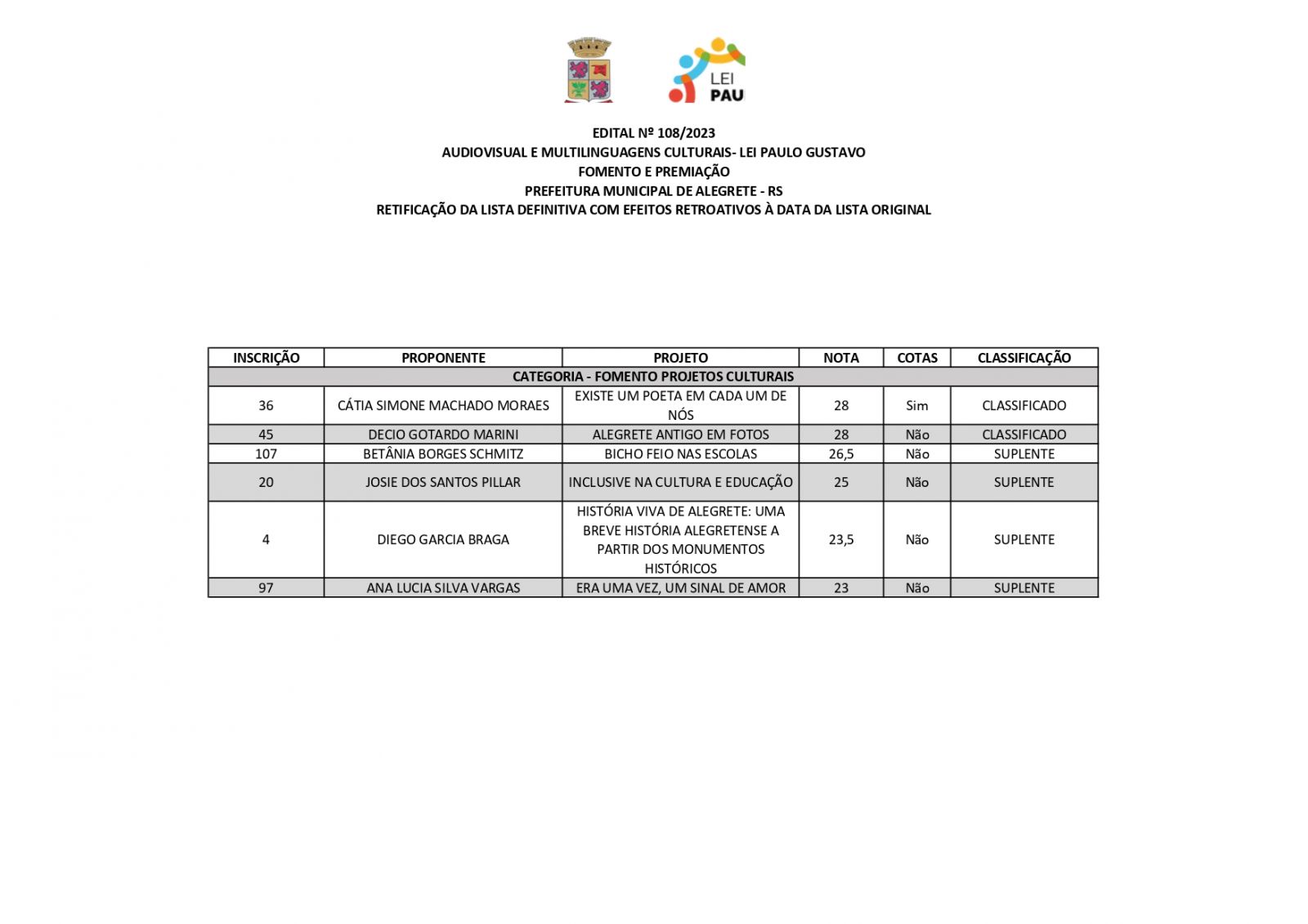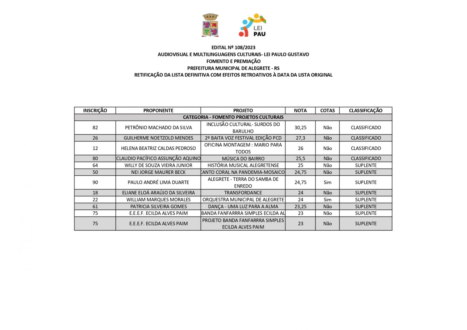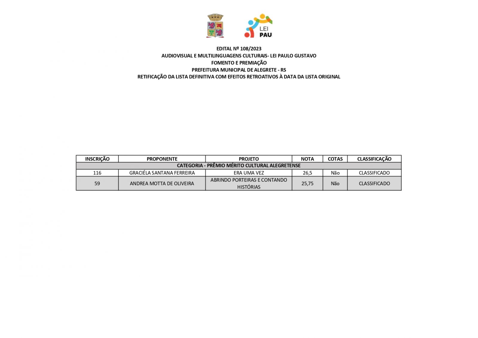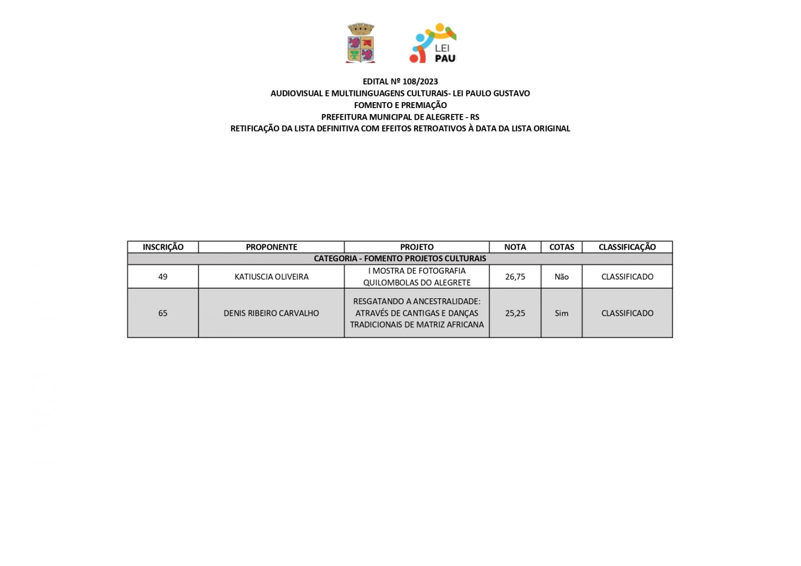 A Prefeitura de Alegrete, por meio da Secretaria de Educação, Cultura, Esporte e Lazer (Secel), através da Diretoria de Cultura, divulga retificação do resultado final dos projetos estabelecidos no edital n°108/2023, referente a Lei Complementar n°195/2022 – Lei Paulo Gustavo – nesta terça-feira, 19 de dezembro.