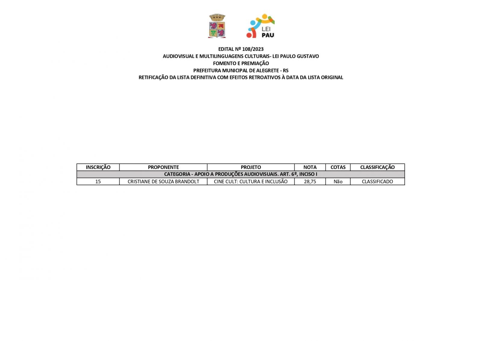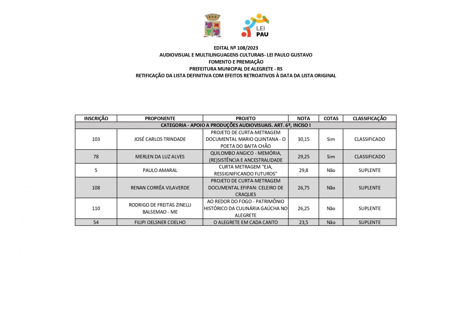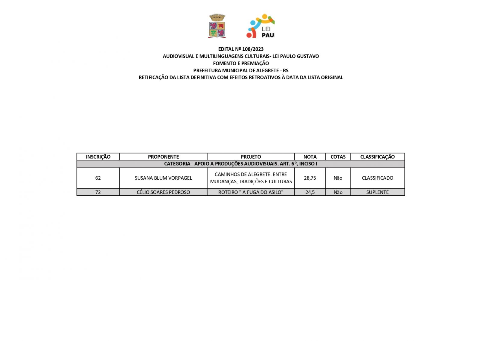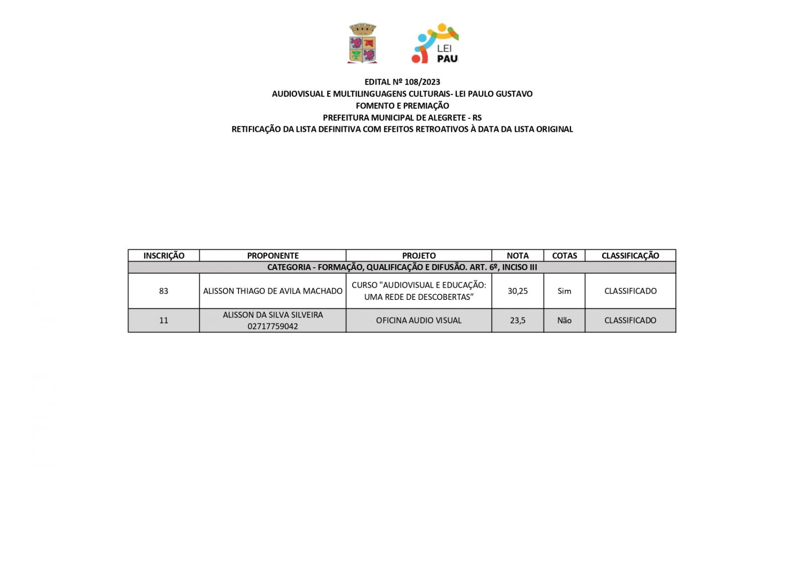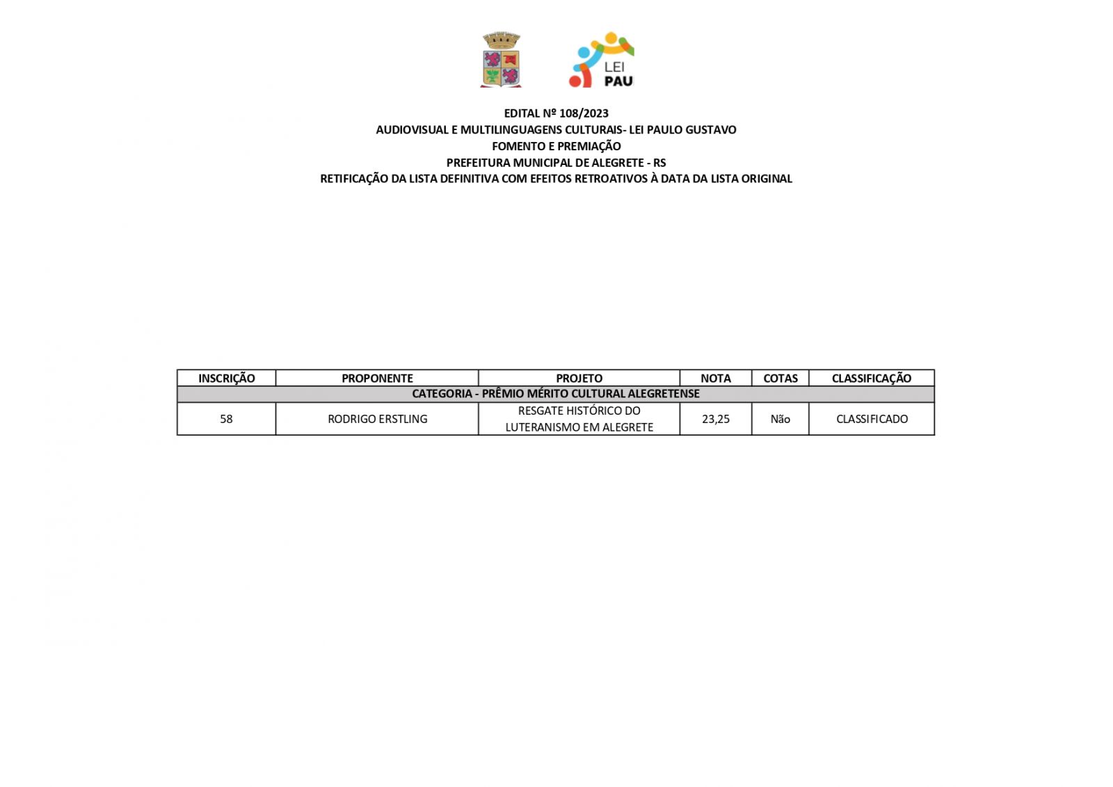 A Prefeitura de Alegrete, por meio da Secretaria de Educação, Cultura, Esporte e Lazer (Secel), através da Diretoria de Cultura, divulga retificação do resultado final dos projetos estabelecidos no edital n°108/2023, referente a Lei Complementar n°195/2022 – Lei Paulo Gustavo – nesta terça-feira, 19 de dezembro.
