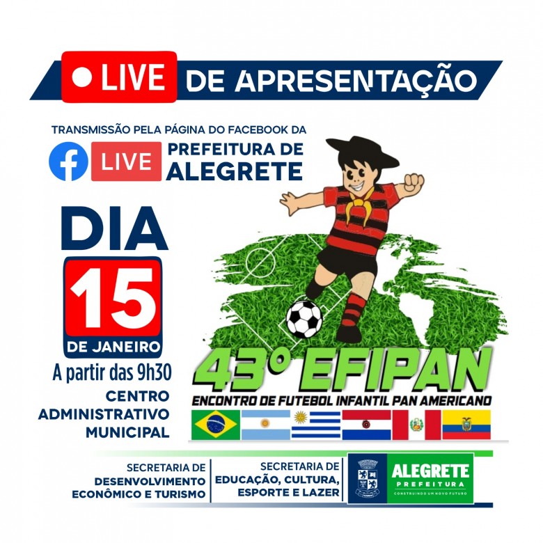 A prefeitura de Alegrete realizará uma Live de Apresentação da 43ª edição do Encontro de Futebol Infantil Pan - Americano (EFIPAN), no dia 15 de janeiro, às 9h30, no Centro Administrativo Municipal.