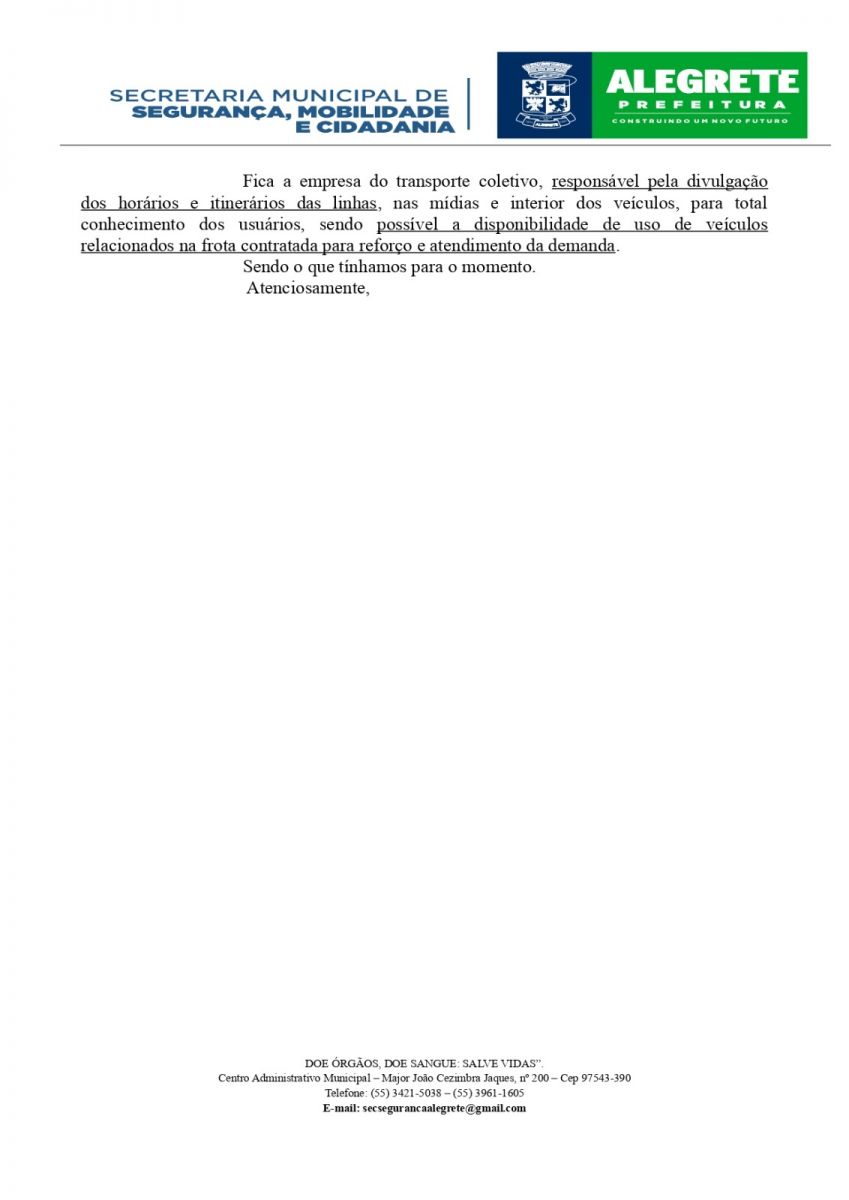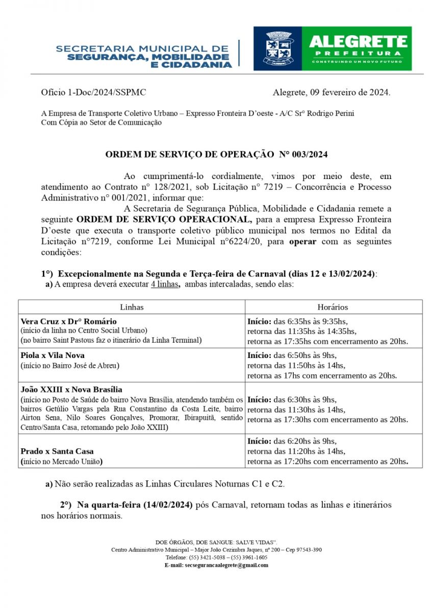 A Prefeitura de Alegrete, por meio da Secretaria de Segurança Pública, Mobilidade e Cidadania, através da Ordem de Serviço Operacional n°003/2024, divulga o funcionamento das linhas de transporte coletivo público municipal que serão operadas durante o período de Carnaval, conforme Lei Municipal n° 6224/20.