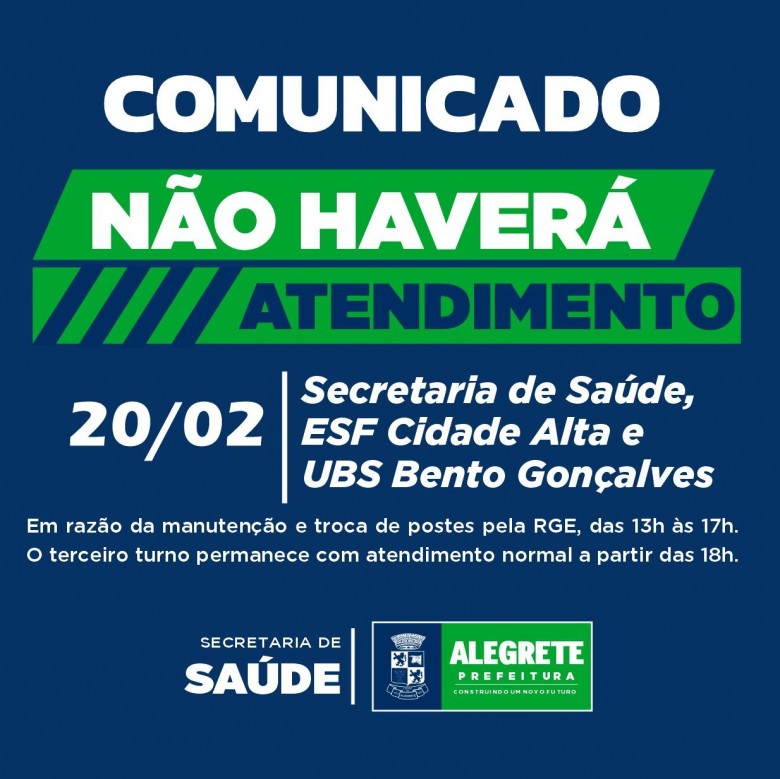A Prefeitura de Alegrete, por meio da Secretaria de Saúde, comunica que não haverá atendimento na Secretaria de Saúde, ESF Cidade Alta e UBS Bento Gonçalves (prédio do antigo PAM), em razão da manutenção e troca de postes pela RGE, das 13h às 17h.