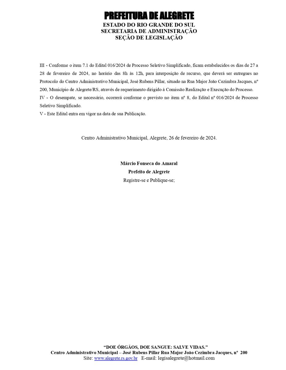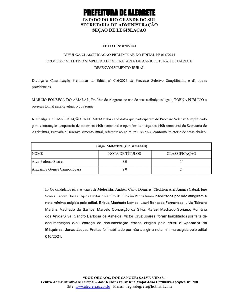 A Prefeitura de Alegrete, por meio da Secretaria de Agricultura, Pecuária e Desenvolvimento Rural, lançou o edital de n°020/2024 nesta segunda-feira, 26, o qual divulga classificação preliminar referente ao Processo Seletivo Simplificado de contratação temporária para os cargos de Motoristas (40h semanais) e Operadores de Máquinas (40h semanais), conforme o edital n°016/2024.