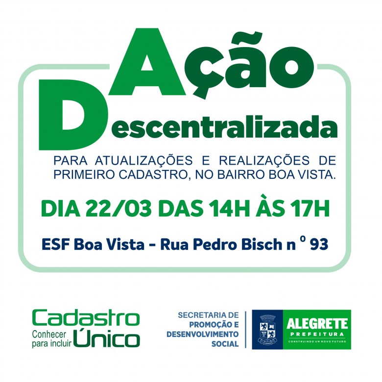 A Prefeitura de Alegrete, por meio da Secretaria de Promoção e Desenvolvimento Social, através do Setor do Cadastro Único/PBF, realizará uma “Ação Descentralizada” para atualizações e realizações de primeiro cadastro, no próximo dia 22 de março, no bairro Boa Vista. Em parceria com representantes do bairro, através da presidente Mara Rejane Ribeiro da Silva, também serão passadas informações gerais sobre o setor, das 14h às 17h, na ESF Boa Vista – rua Pedro Bisch n ⁰ 93.