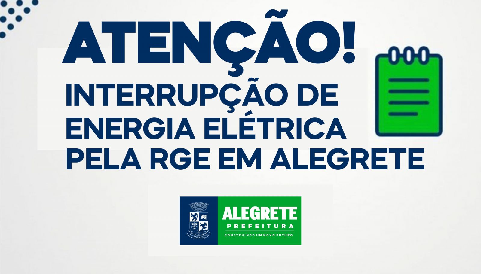 A RGE comunica que haverá interrupção no fornecimento de energia elétrica, devido a manutenção e melhorias, o que afeta algumas regiões do município de Alegrete entre os dias 01 e 04 de abril. Confira os períodos e locais onde haverá interrupções nos links a seguir: