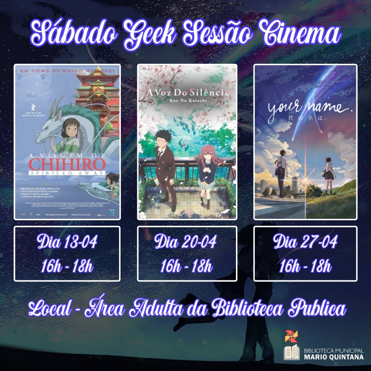 13/4: Viagem de Chihiro; A voz do silêncio 20/4; 27/4: Your name
