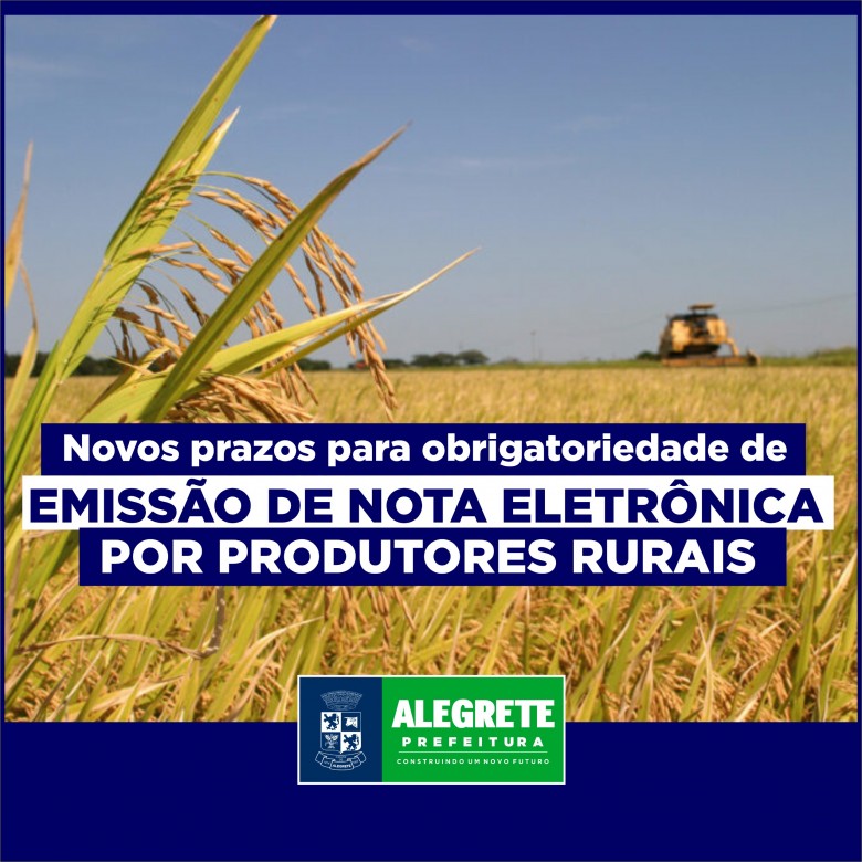 A Prefeitura de Alegrete, por meio da Secretaria de Finanças e Orçamento, informa que, o Conselho Nacional de Política Fazendária – CONFAZ e a Secretaria Especial da Receita Federal do Brasil, na 393ª Reunião Extraordinária do Conselho, realizada em Brasília, DF, no dia 7 de maio de 2024, prorrogou a obrigatoriedade da NF-e para produtores rurais ao dia 02 de janeiro de 2025. A partir desta data, fica vedada a emissão de nota fiscal modelo 4.