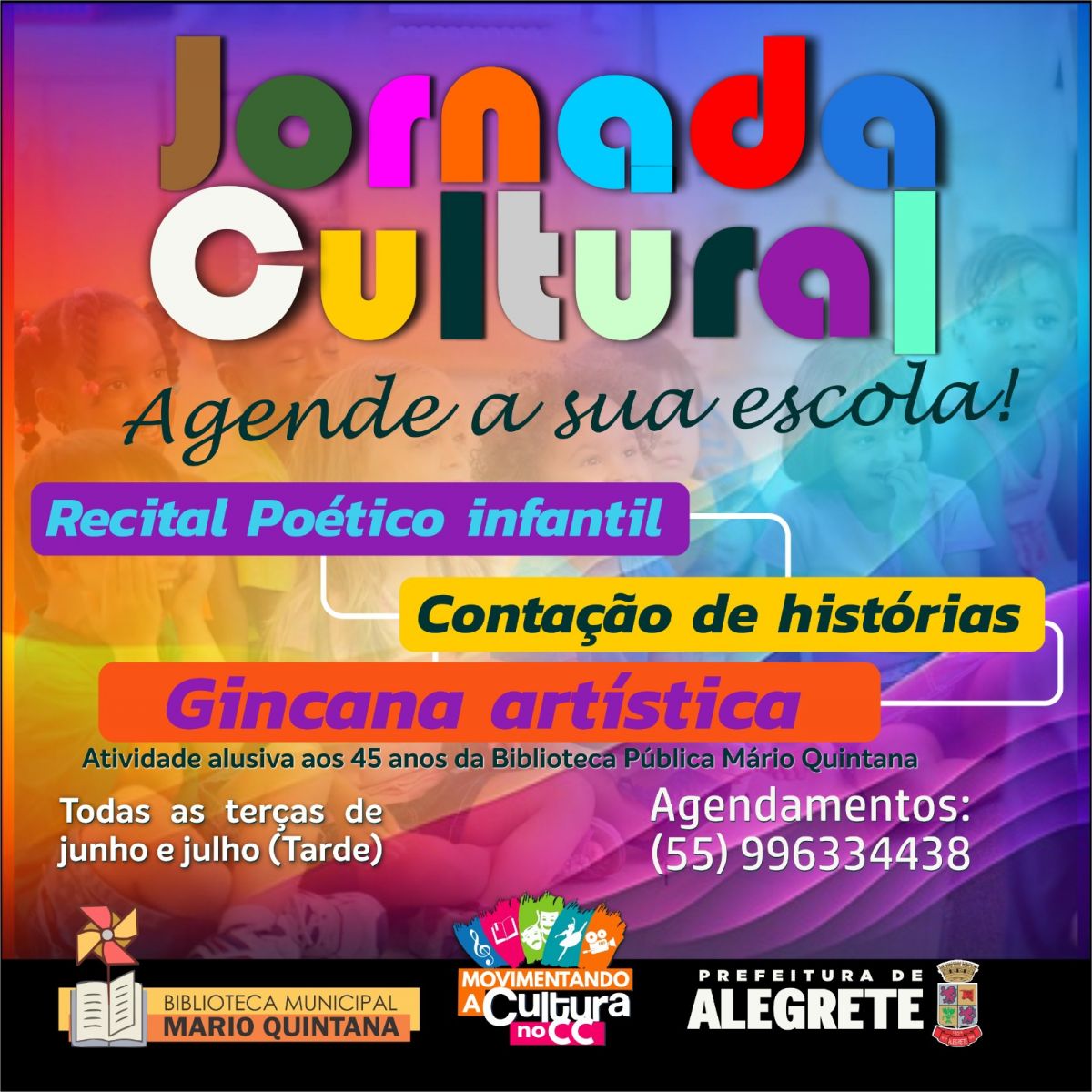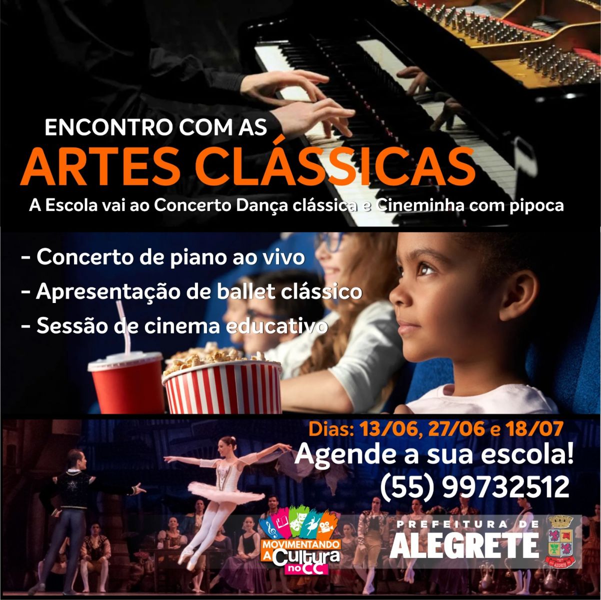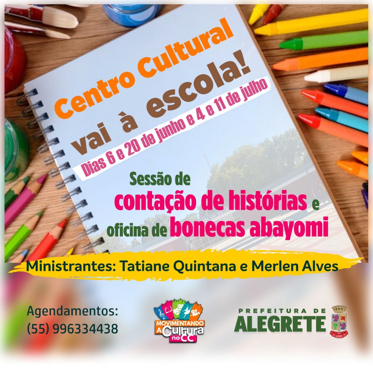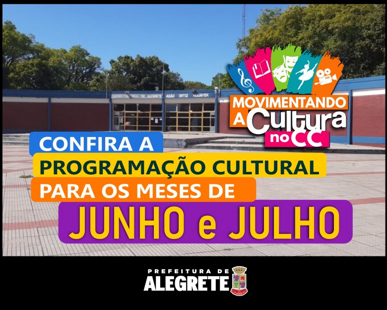 A Prefeitura de Alegrete, através da Secretaria de Cultura, Esporte e Lazer por meio do projeto Movimentando a Cultura no CC, preparou uma programação especial para os meses de junho e julho. As atividades contemplam as mais variadas linguagens artísticas, como música, dança, cinema, literatura, e têm como foco principal atender estudantes das escolas públicas e privadas de Alegrete. Confira abaixo a programação completa e agende-se: