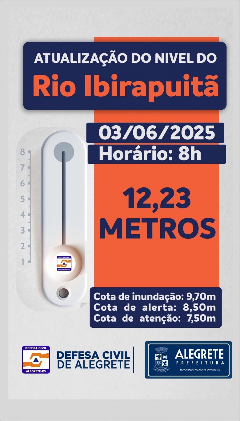 A Prefeitura de Alegrete, por meio da Defesa Civil, realizou mais um procedimento de medição dos níveis do rio Ibirapuitã na manhã desta terça-feira, 03. O rio encontra-se 12,23m acima do normal, com 197mm acumulados, conforme última atualização (08h).