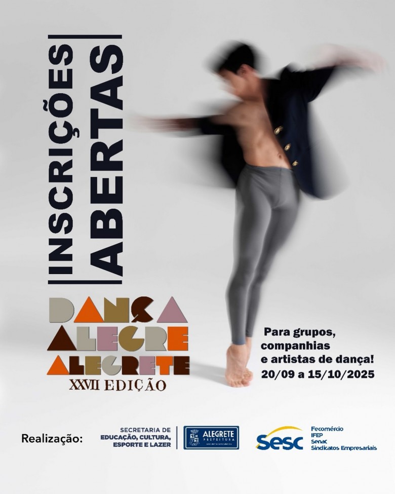 Estão abertas as inscrições para o 27º Dança Alegre Alegrete, um dos mais importantes e tradicionais festivais de dança do estado, que acontecerá de 2 a 7 de dezembro de 2025. O evento, realizado no Largo do Centro Cultural Adão Ortiz Houayek, promete reunir artistas, grupos e companhias de todo o Rio Grande do Sul em uma celebração da arte do movimento.