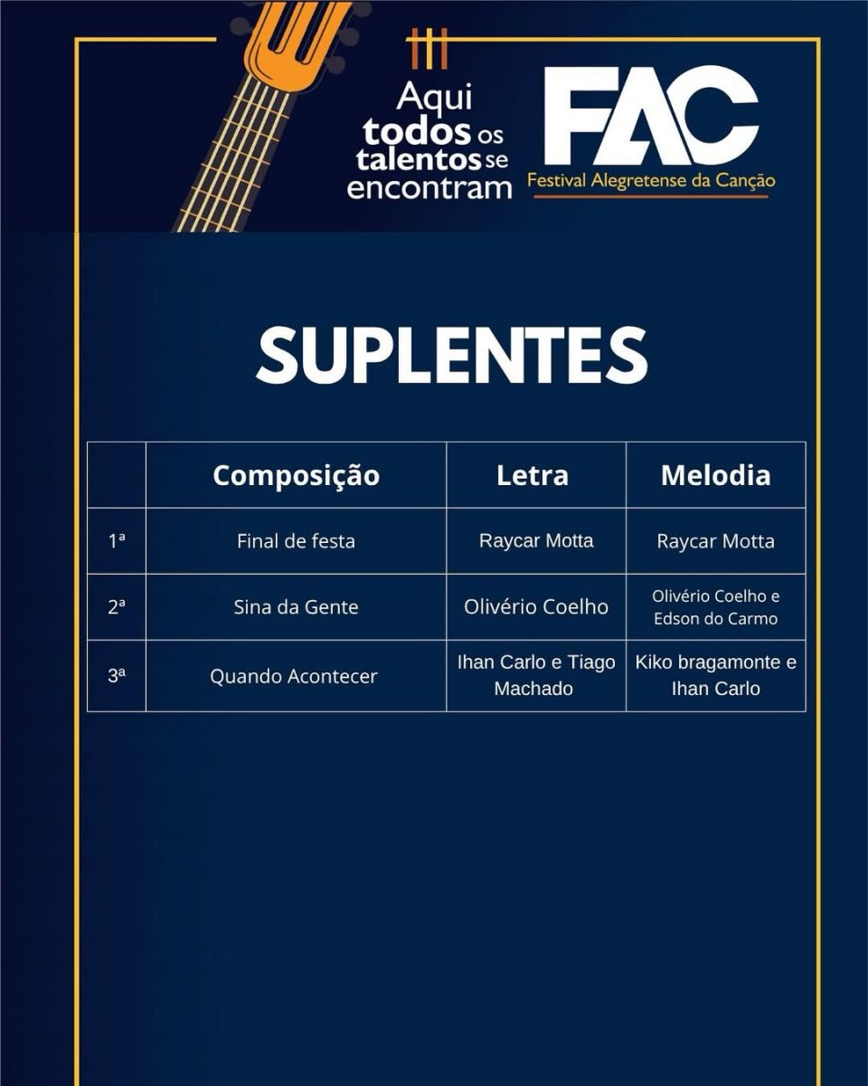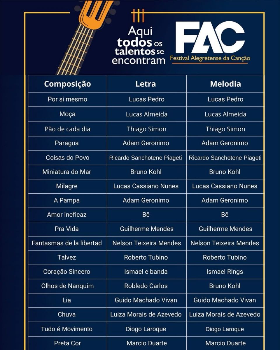 A Prefeitura de Alegrete, por meio da Secretaria de Educação, Cultura, Esporte e Lazer, divulga a lista dos classificados e supletes a participar no Festival Alegretense da Canção (2025). Confira a lista nas imagens a seguir.