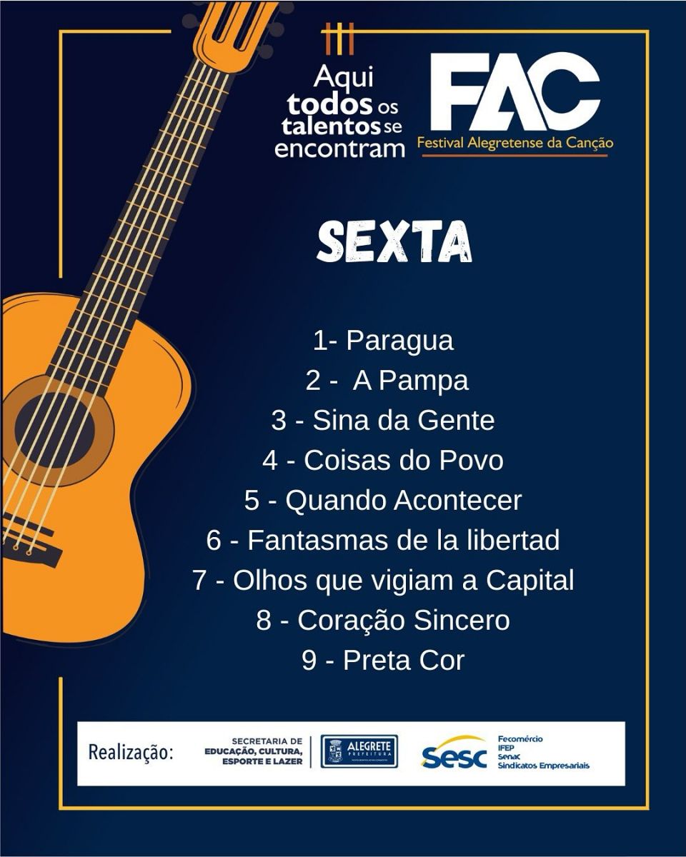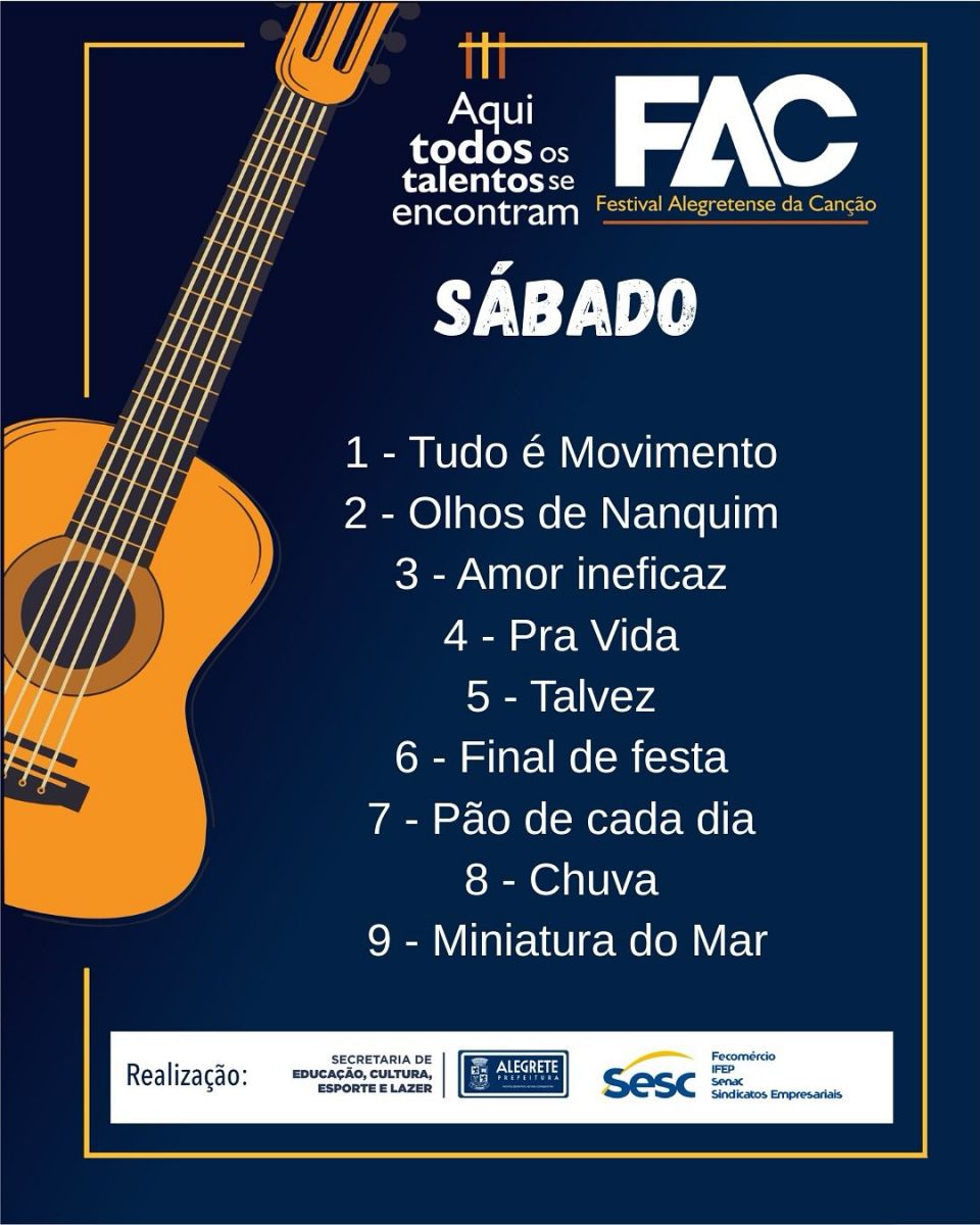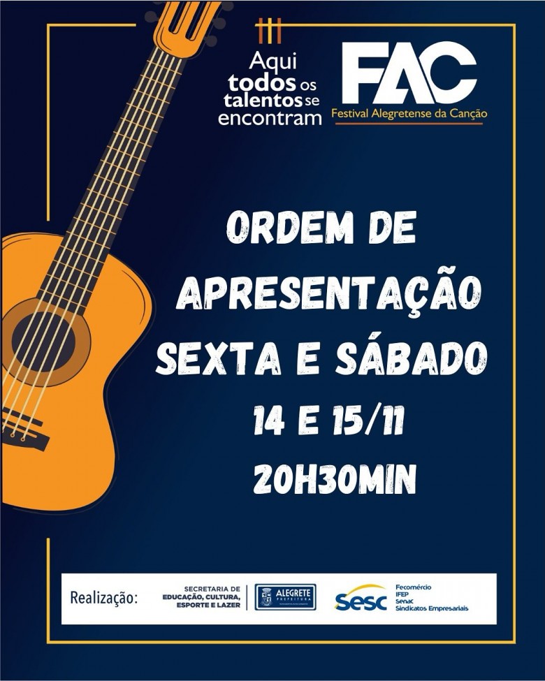 A Prefeitura de Alegrete, por meio da Secretaria de Educação, Cultura, Esporte e Lazer, em parceria com o SESC, divulga a ordem de apresentação do Festival Alegretense da Canção - FAC, que ocorrerá entre os dias 14 e 16 de novembro, no Largo do Centro Cultural.