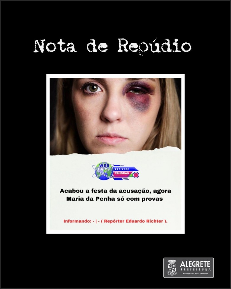 A Prefeitura de Alegrete vem a público manifestar seu veemente repúdio às recentes publicações da página Web Notícias Alegrete, no Facebook (Web Tv + Notícias 24h), que atacam e buscam desacreditar a eficácia e a importância da Lei Maria da Penha, que é um marco na legislação brasileira e um instrumento reconhecido internacionalmente pela ONU como uma das legislações mais avançadas do mundo no combate à violência contra a mulher.