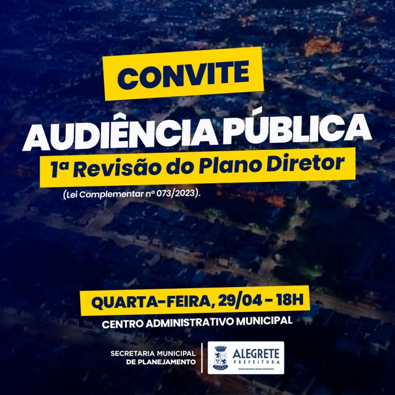 A Prefeitura de Alegrete, por meio da Secretaria Municipal de Planejamento, promove nesta quarta-feira, dia 29 de abril, uma audiência pública para debater a 1ª Revisão do Plano Diretor do Município, conforme estabelece a Lei Complementar nº 073/2023.